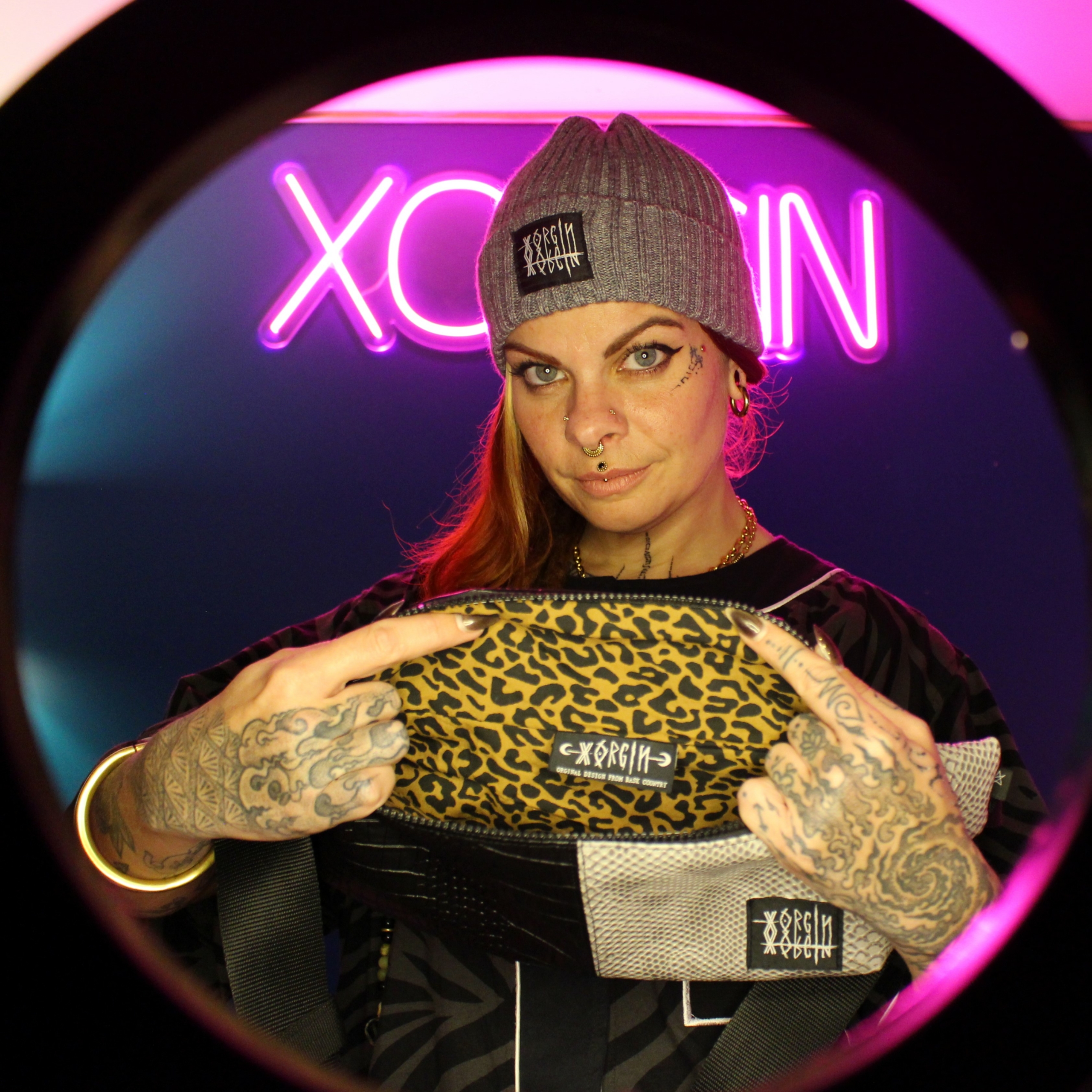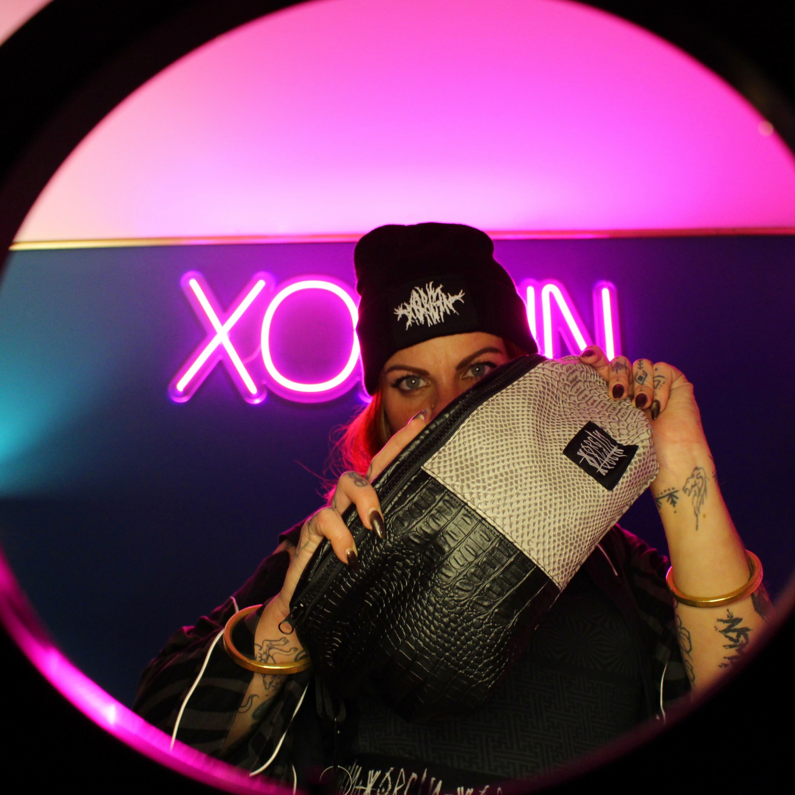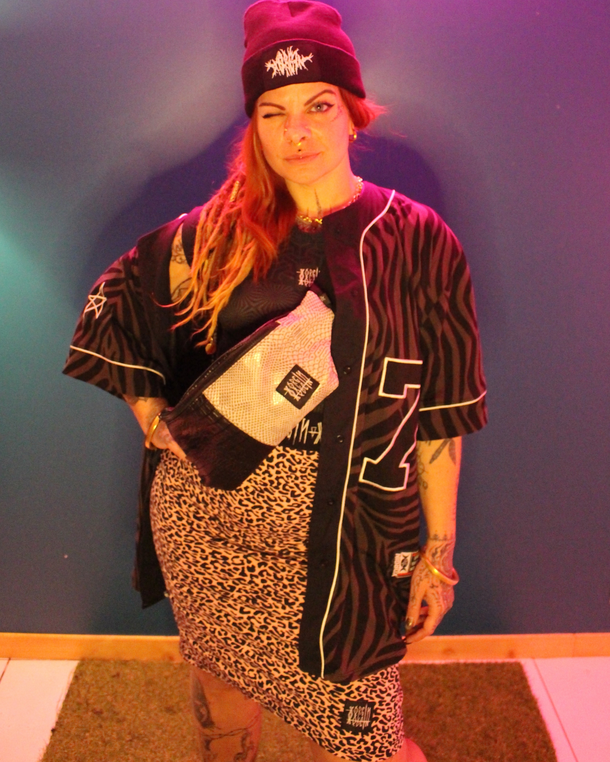 SISTERHOOD ( Modèle ) porte le nouveau bonnet Basic PATCH et le bonnet côte gris , La chemise de Baseball Zebra dark grey , le Body OLYSTIK et la jupe midi TRIPY