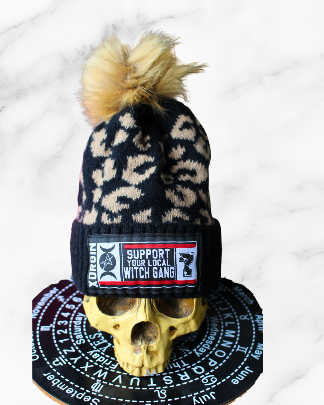 Il associe motif léopard, pompon oversize et matière acrylique chaude pour un style affirmé jusque sur les pistes ou en pleine ville.