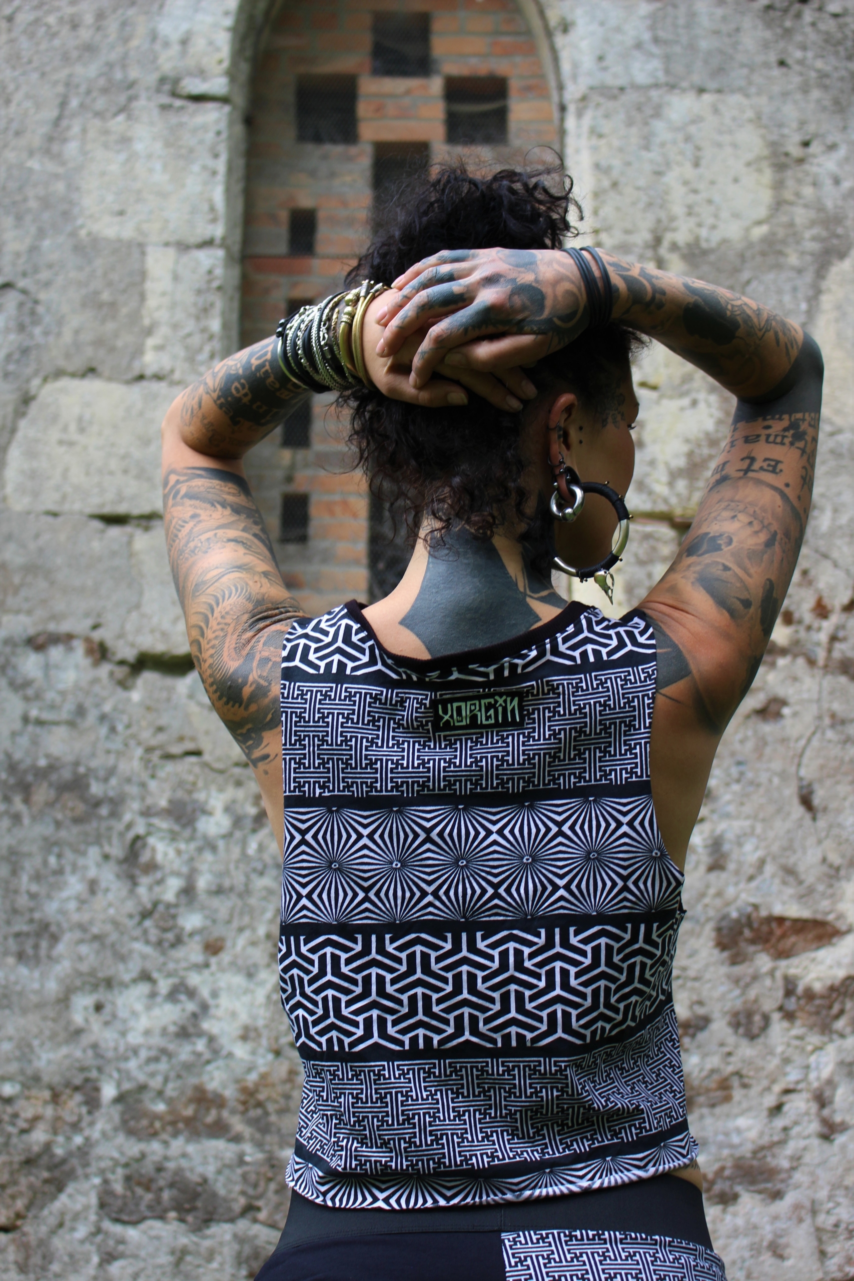 Crop Top KREW Version Devant Black sérigraphié et dos pattern géométrique Noir et Blanc