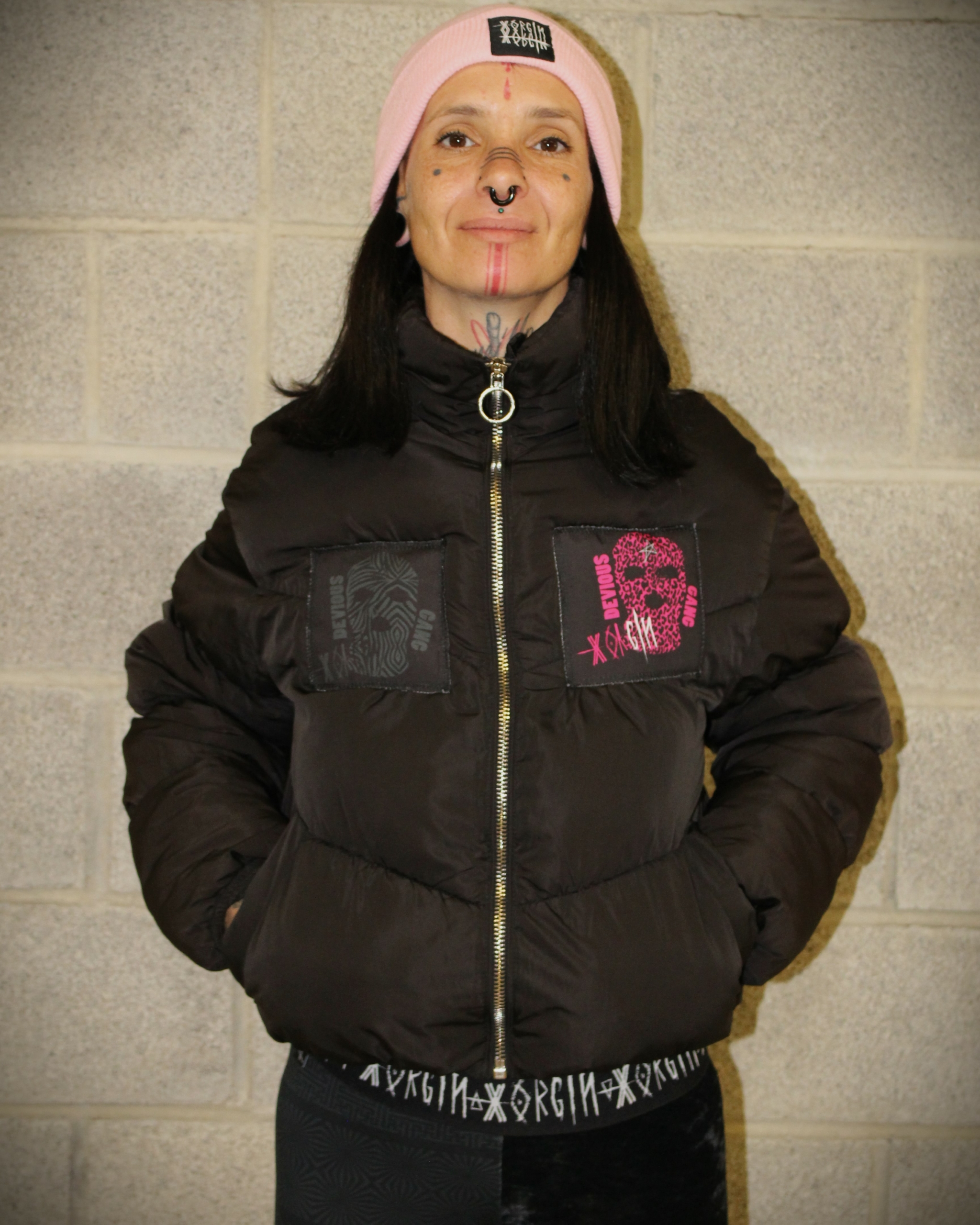 Pièce unique, Doudoune Up’cycling “Darkness” XORGIN WEAR Inspirée de la mode warehouse techno. Style rave éco-responsable affuté.