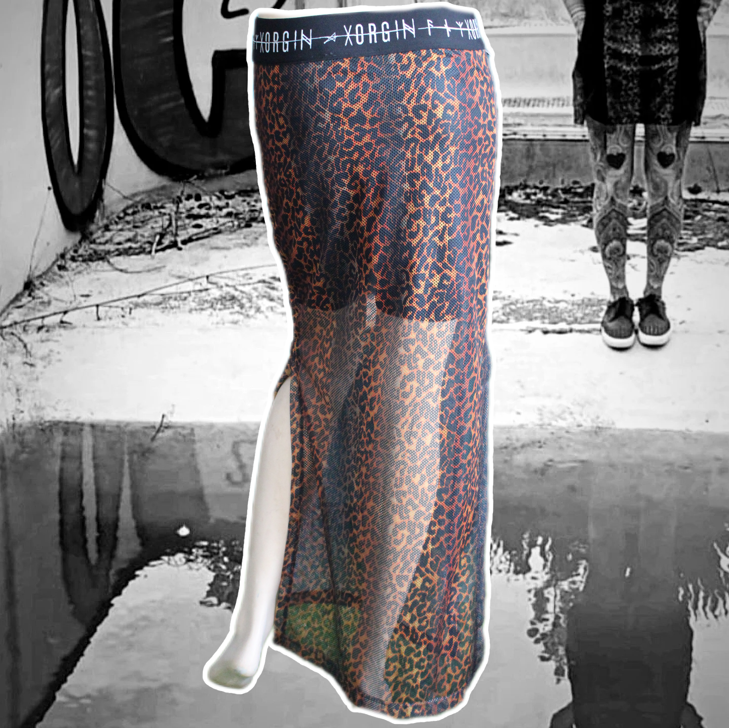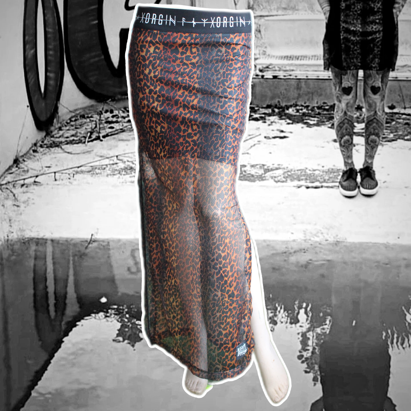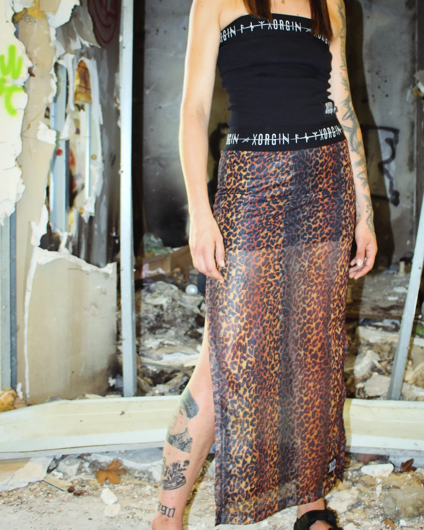jupe longue streetwear créateur, jupe léopard transparente, rave clothing femme, mode alternative Xorgin, outfit moderne et stylé, tattoo freaks look, vêtement free party.