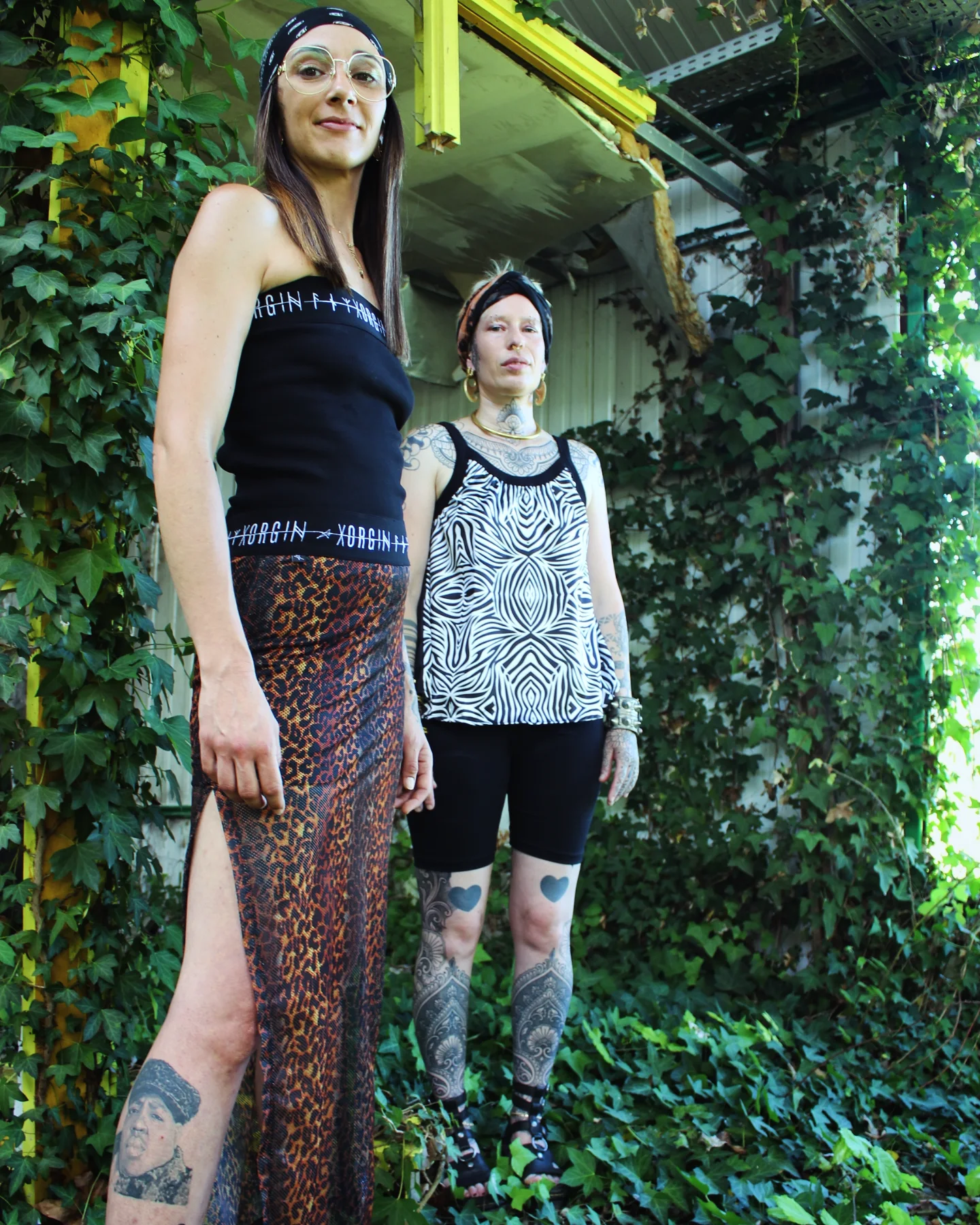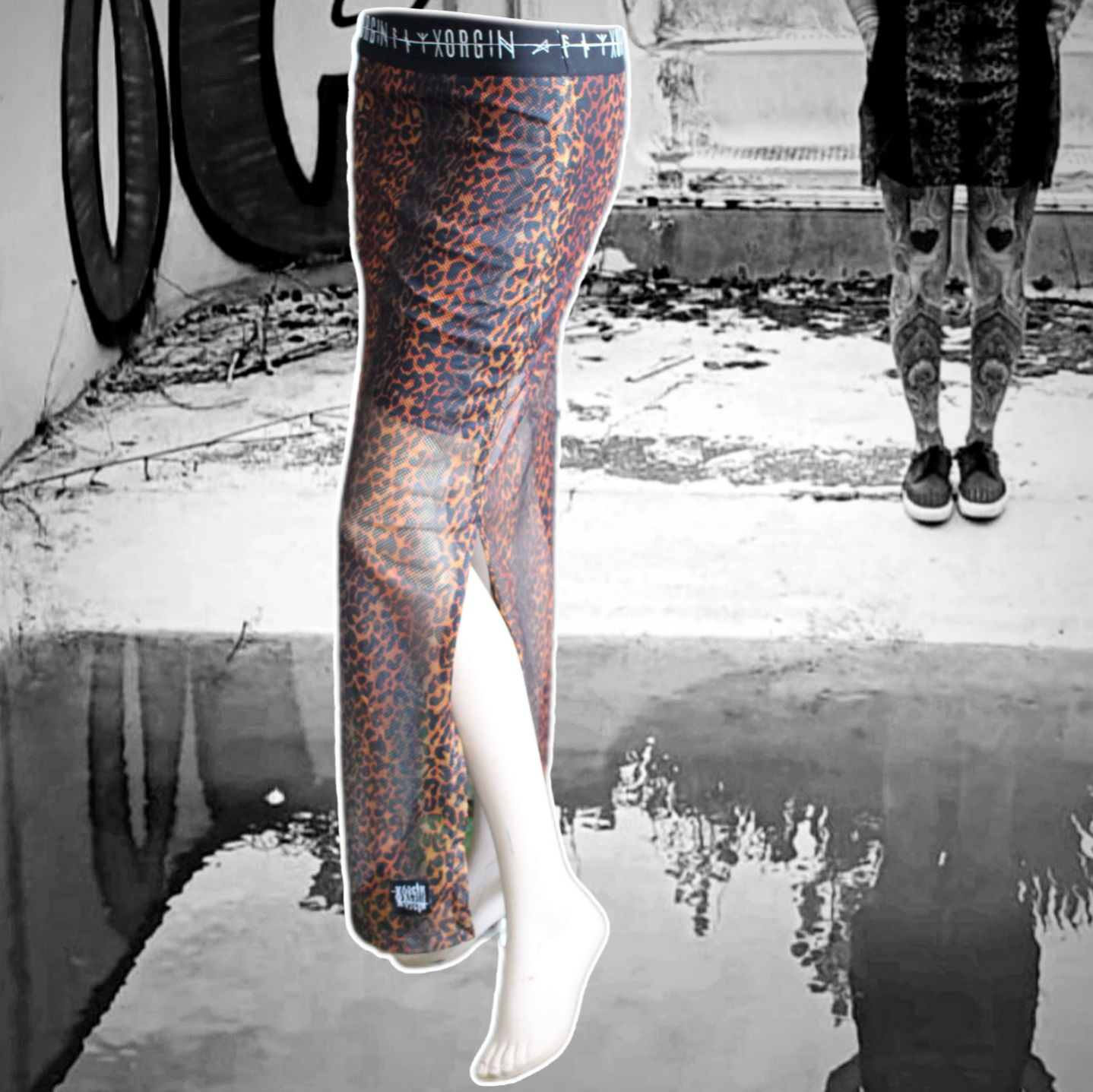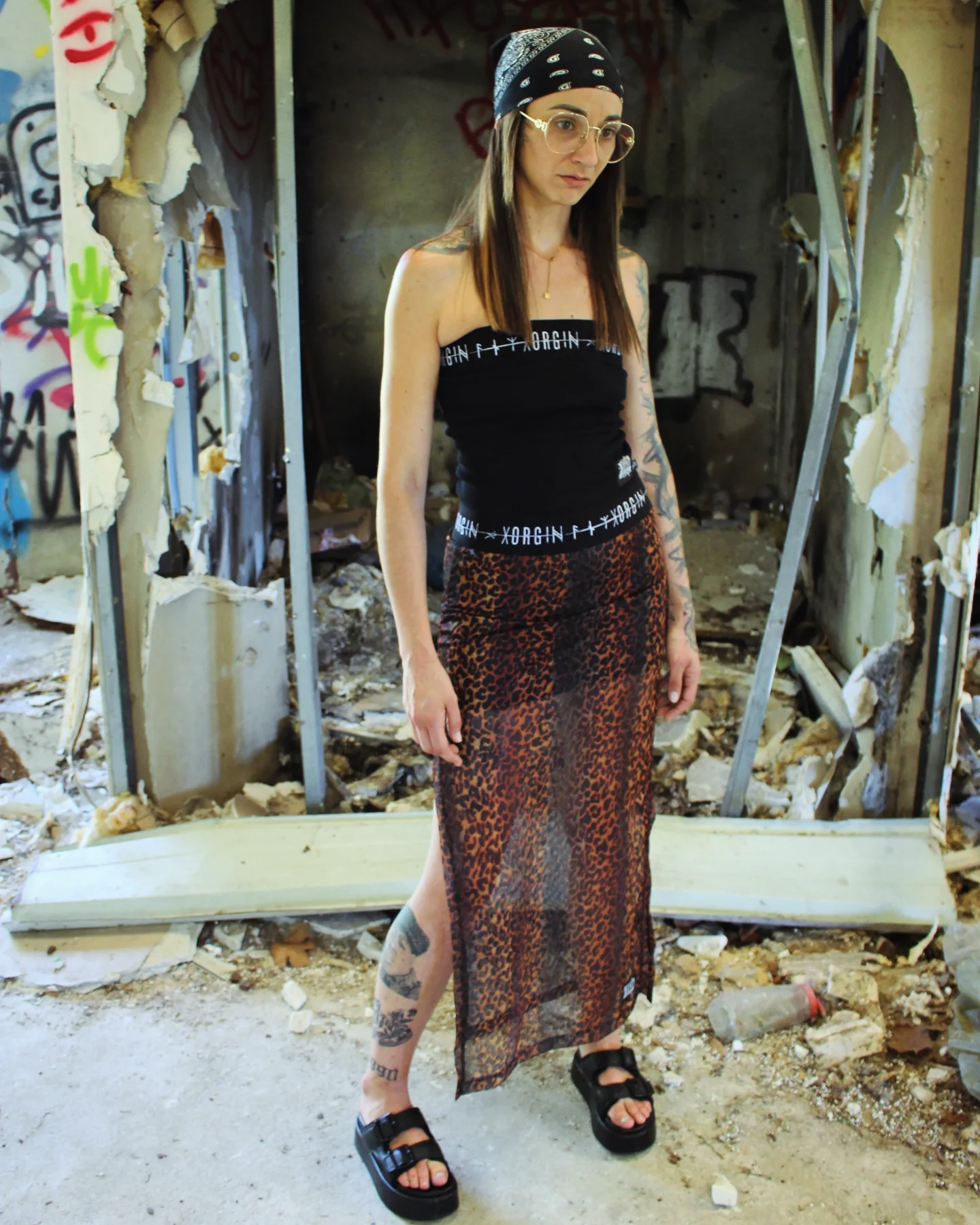 jupe longue streetwear créateur, jupe léopard transparente, rave clothing femme, mode alternative Xorgin, outfit moderne et stylé, tattoo freaks look, vêtement free party.