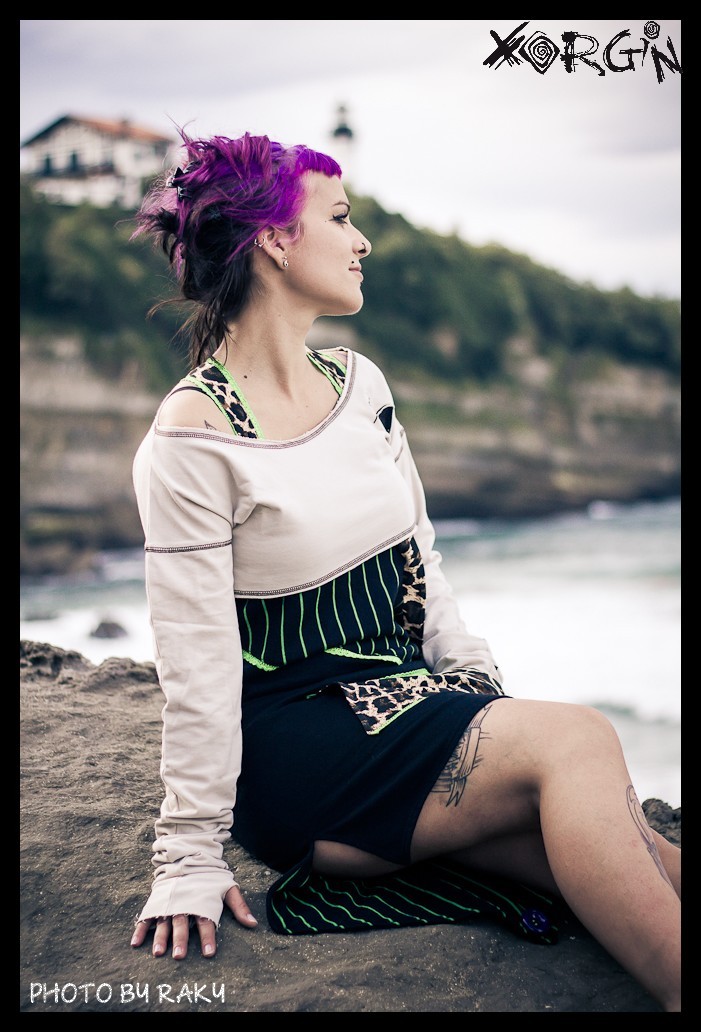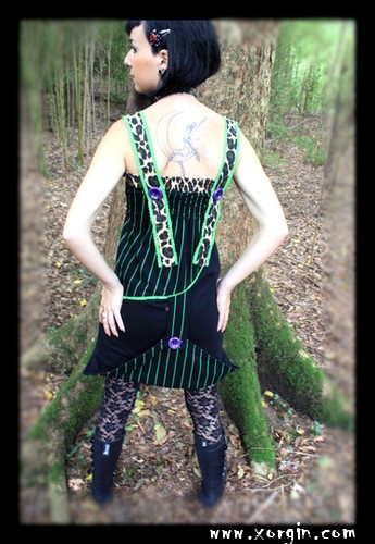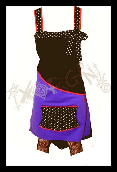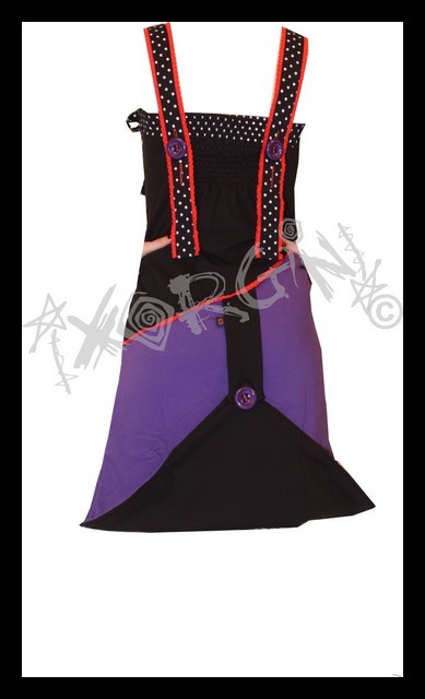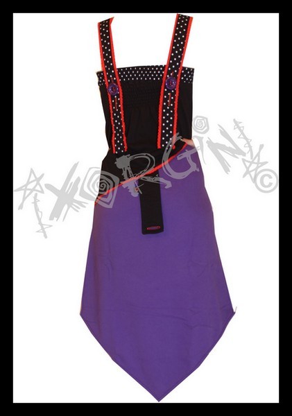 La queue de pie peut se remonter et s’attacher pour former une tunique grâce à une patte et un gros bouton en plastique dark violet.