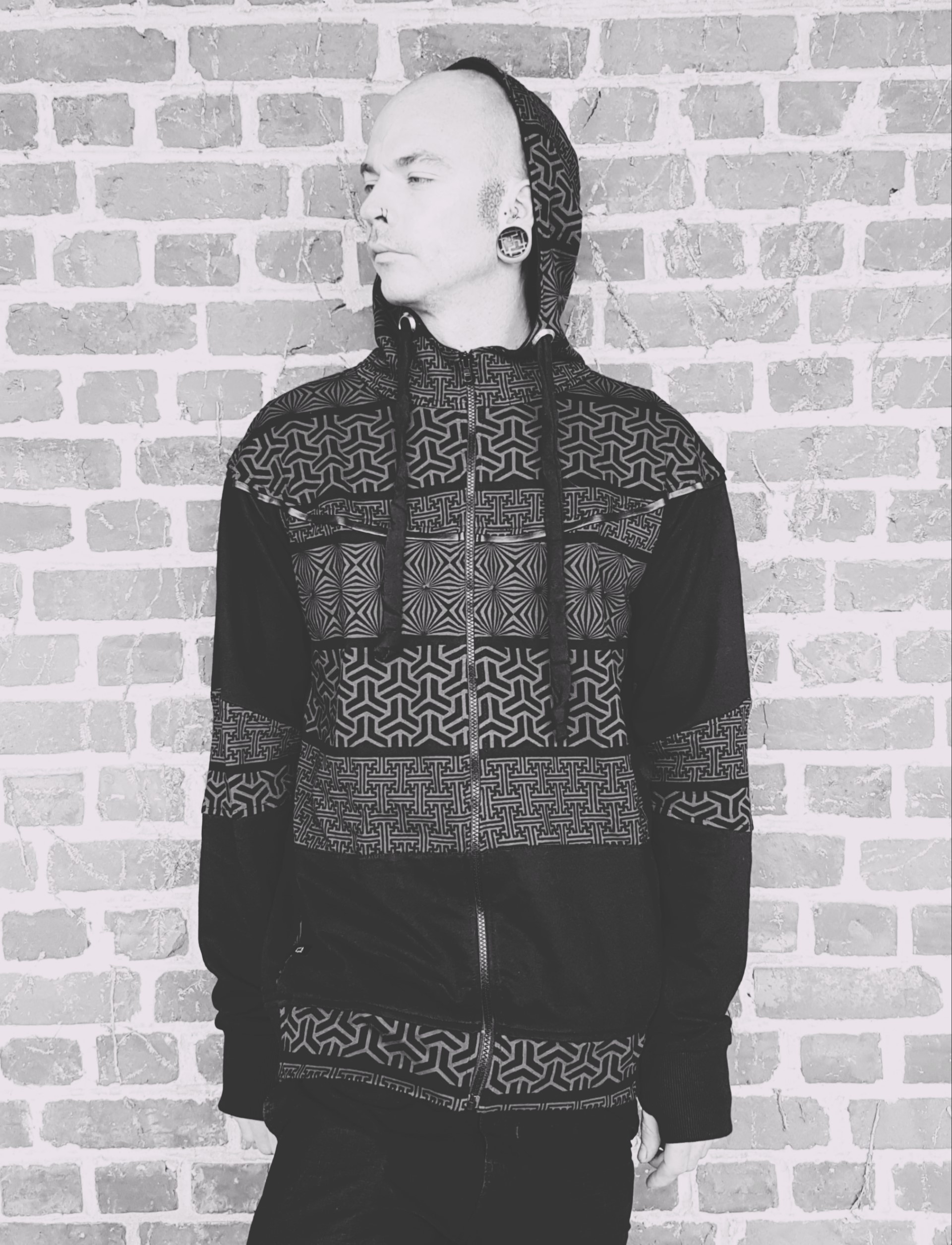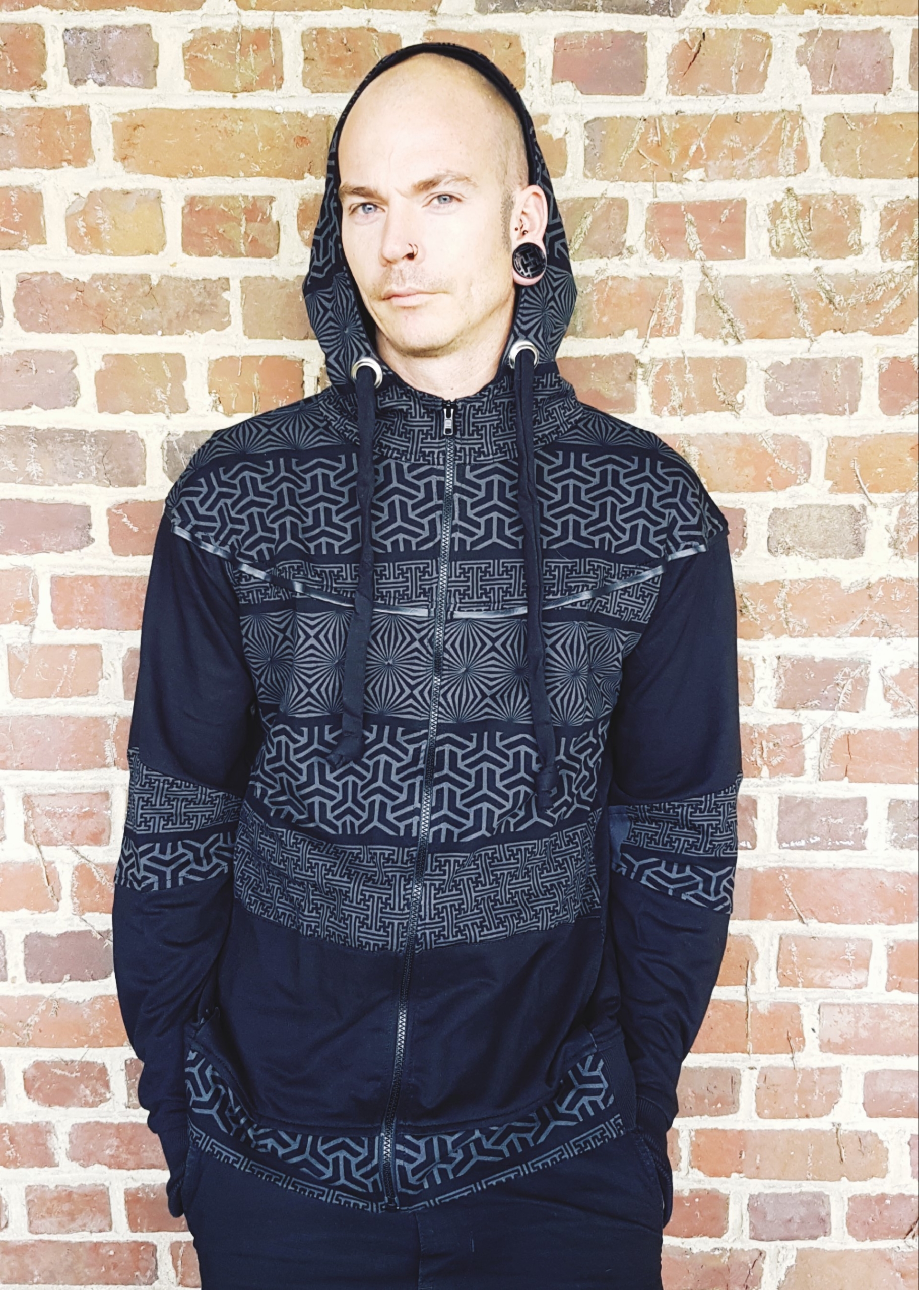 Veste / Sweat shirt zippé VODOO 3.0 en molleton 100% coton imprimé. Tissus aux motifs géométriques des créations XORGIN.