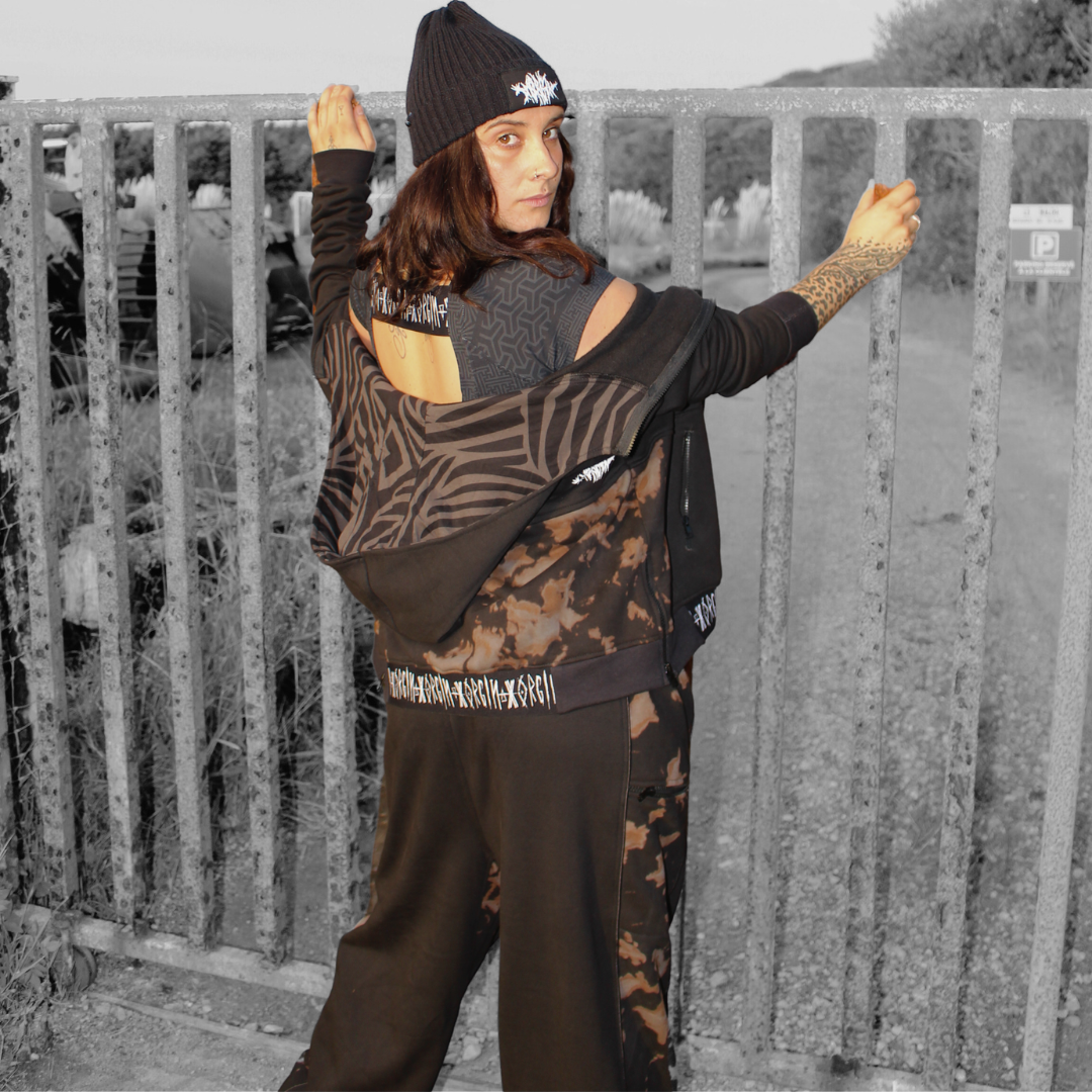 • Grande capuche doublée en jersey zébra Dark grey avec col montant.