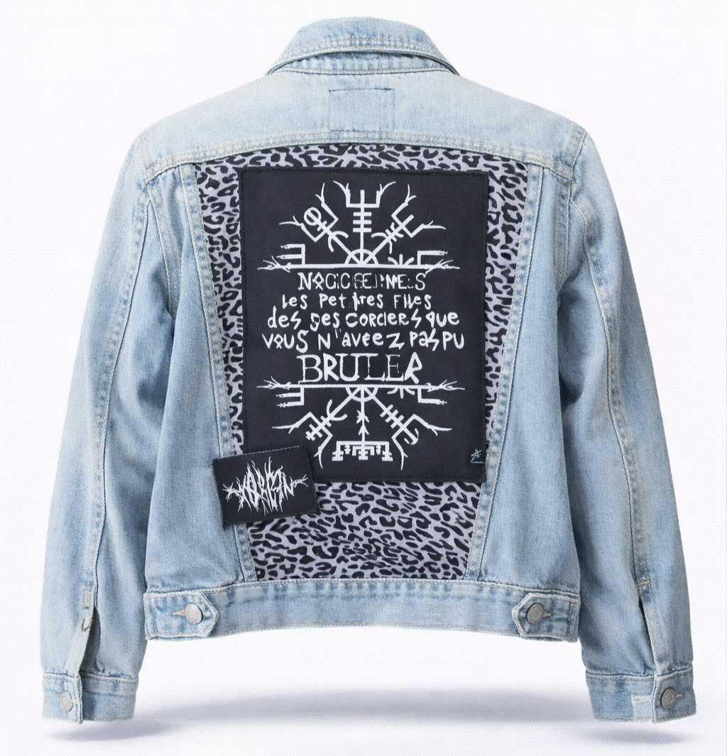 Veste en jean upcyclée, dos léopard avec patch slogan XORGIN.